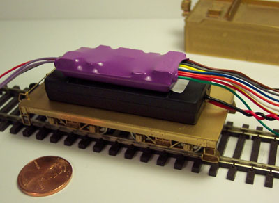 The HO scale tender shown below is receiving a SoundTraxx Tsunami decoder and a Rail Master self contained speaker. The picture shows the decoder/speaker stack before the installation. The Tsunami is a outstanding sound decoder and features everything a steam fan could ever want. The Rail Master speaker is a neat self contained unit that has an oval speaker and a ported enclosure all in one piece. These parts are typical of the high quality parts I install at BrassMechanics.